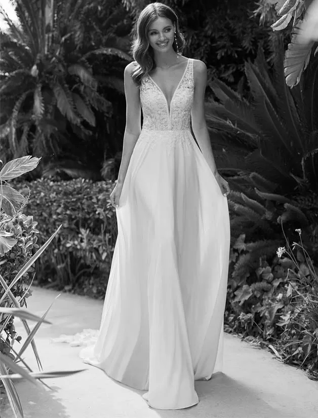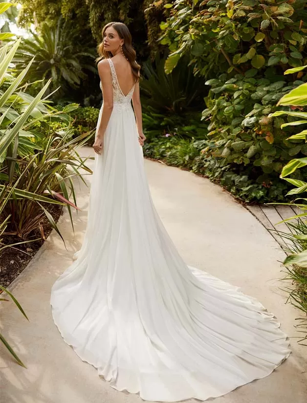 Abito da sposa a trapezio stile principessa, realizzato in georgette abbinata a pizzi impreziositi da perline;