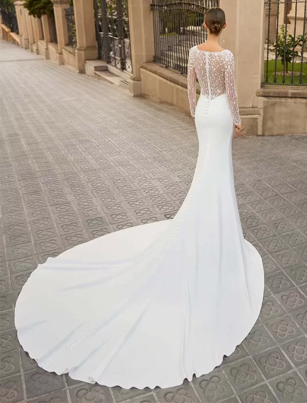 Arnia è la quintessenza della raffinatezza. Un abito sirena con il corpetto ricamato di strass con scollo a V ed eleganti maniche lunghe che accompagnano la schiena in tessuto effetto illusione. Dalla vita scivola la gonna in crêpe, perfetta per una cerimonia religiosa in autunno.