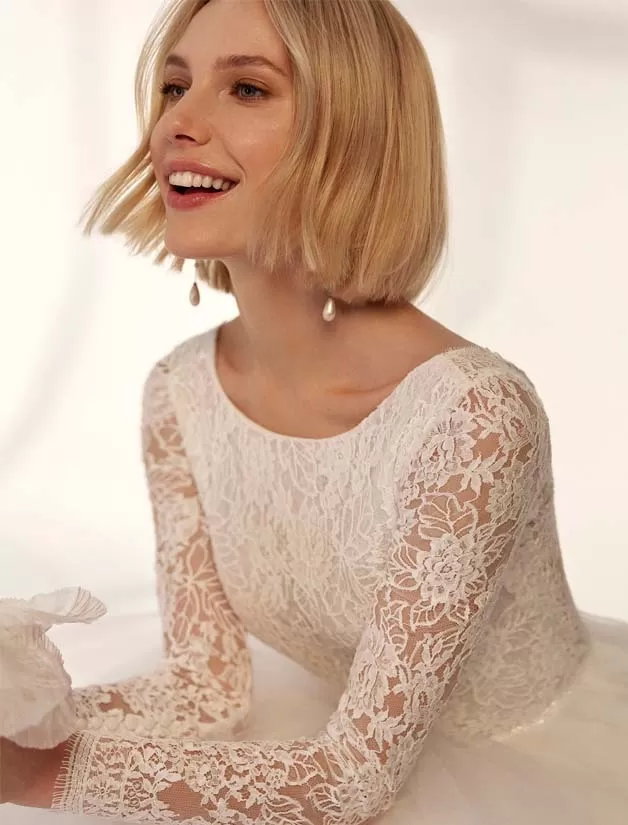 Abito da sposa con gonna redingote in stile classico, confezionato in pizzo con passamaneria a onda di strass e gonna in Amalfi; scollo a V sul davanti e sulla schiena con onde incrociate e tulle effetto illusione; ampia fusciacca in Amalfi e maniche lunghe in pizzo Abito Aire Atelier Esclusivo di alta moda.