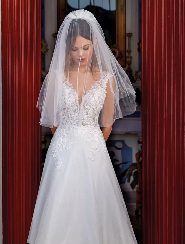 Elegante abito da sposa a sirena in tulle e romantici decori di pizzo all over con strascico. La schiena presenta un incantevole scollo profondo. Sarai un sogno!